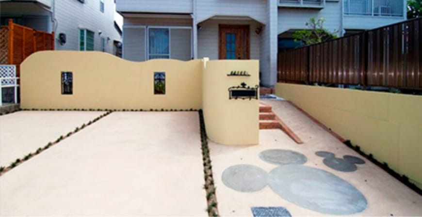 お家に帰るのが待ち遠しくなるようなかわいいキャラクターが迎えてくれるエクステリアができました。 アプローチ床面だけでなく、ポストや表札、駐車場壁のオーナメントなどにちりばめています。