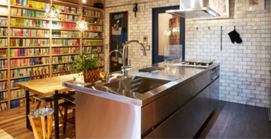 回遊式のアイランドキッチンは使い勝手がよく、解放感があります。キッチン横の壁一面にはサブウェイタイルを施工し、ステンレスのシステムキッチンと相まってモダンな雰囲気に変わりました。