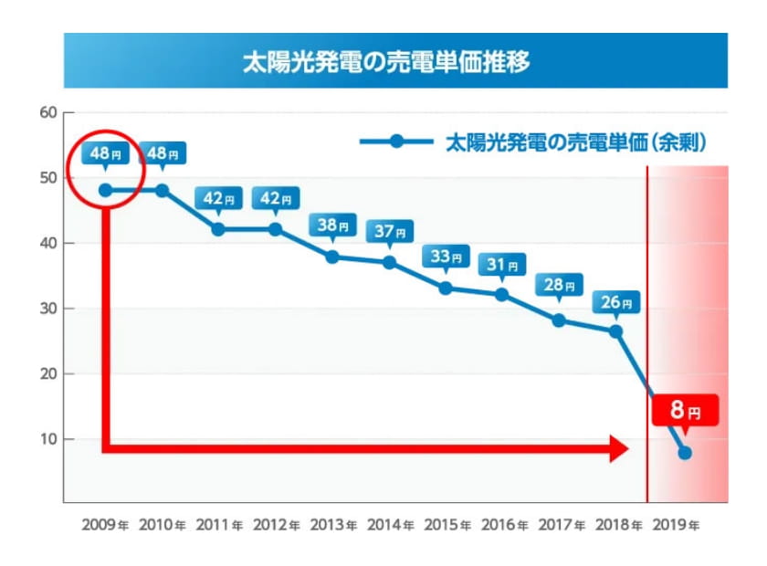 売電期間が順次終了2019年11月に太陽光発電の固定価格買取制度は開始から10年を迎えました。2009年に発電を開始した10kW以下の太陽光発電は48円/kWhという高単価で売電ができましたが、10年を経過し売電期間が終了すると売電価格は7~9円/kWh以下!と、およそ1/6に下落します。 この10年の売電期間が終了することを卒FITと呼んでいます。