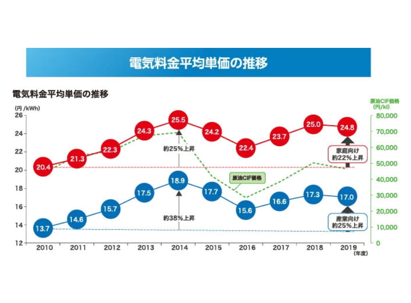 原油価格の下落などにより2014~2016年は低下するものの、その後は再び上昇傾向に。また、再エネ発電普及のための「再エネ賦課金」が電気料金に転嫁されているため今後も電気料金が大きく下がることはないとされています